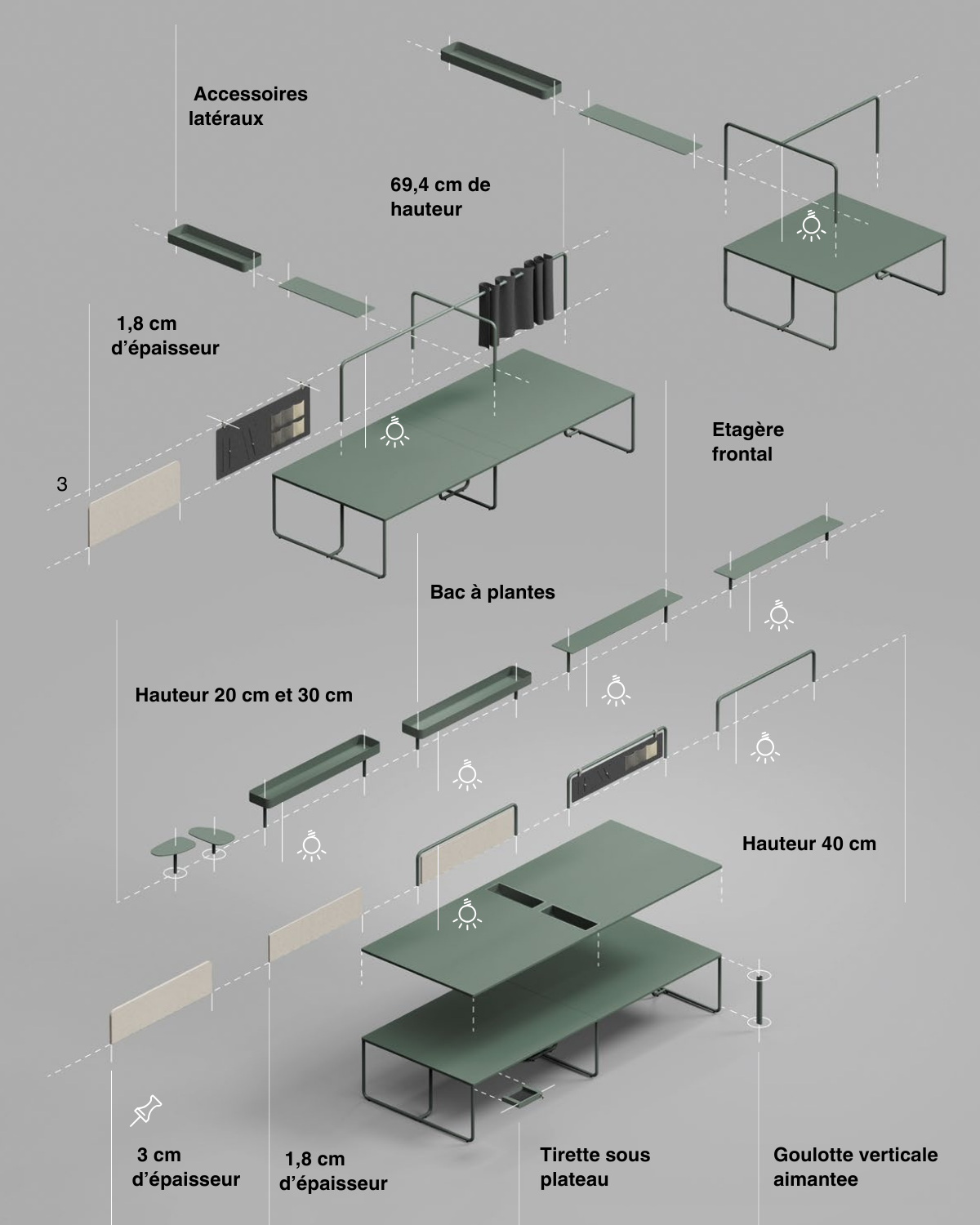Hauteurs personnalisables : version “Pont” (69,4 cm) ou “Écran” (40 cm).