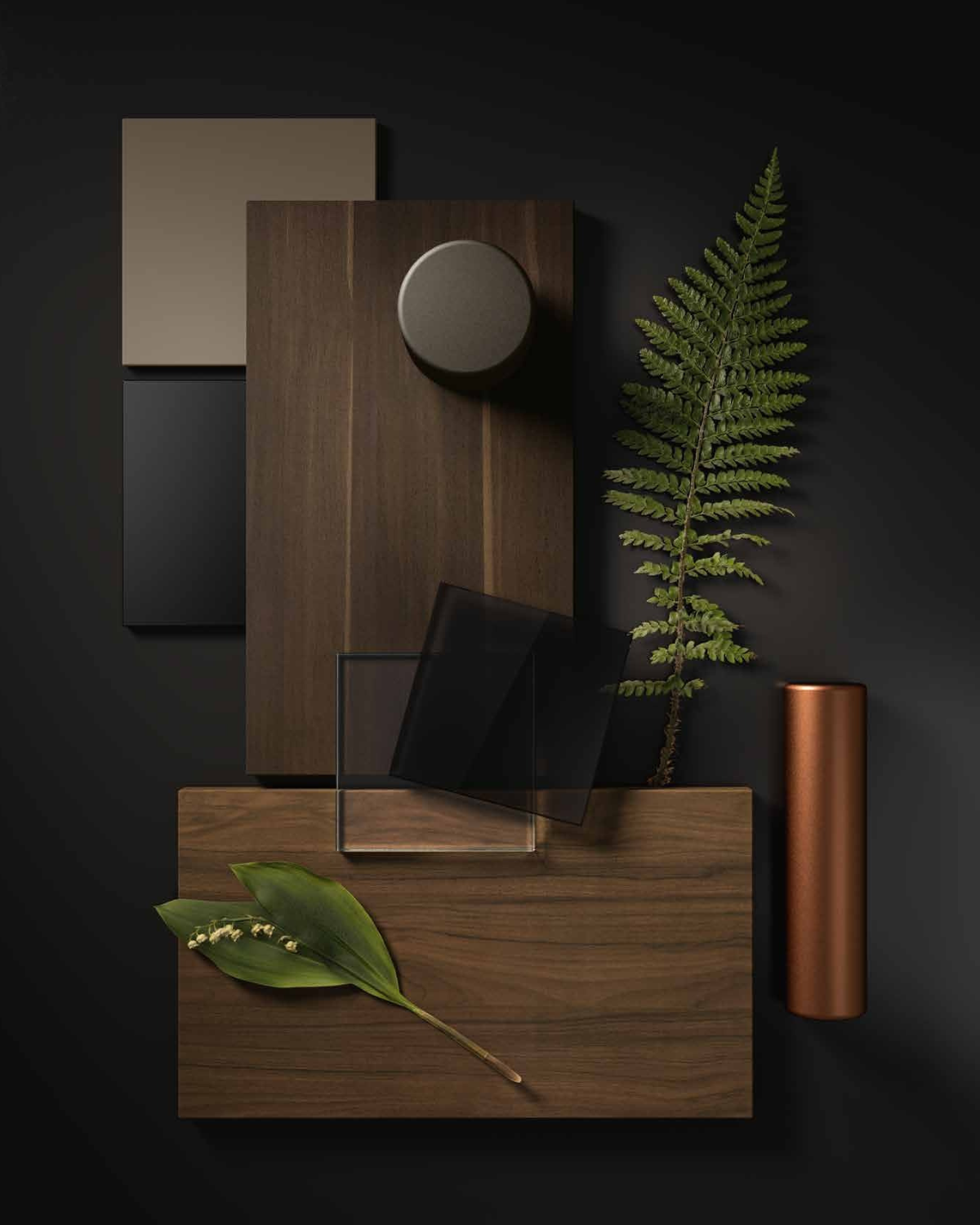 Le meuble de service, intégré au bureau, est composé d’une structure NOYER BOHEME et de portes coulissantes, ainsi que de tiroirs centraux NOIRS avec système d’ouverture PUSH & PULL. Le piètement encastré crée un effet de suspension.