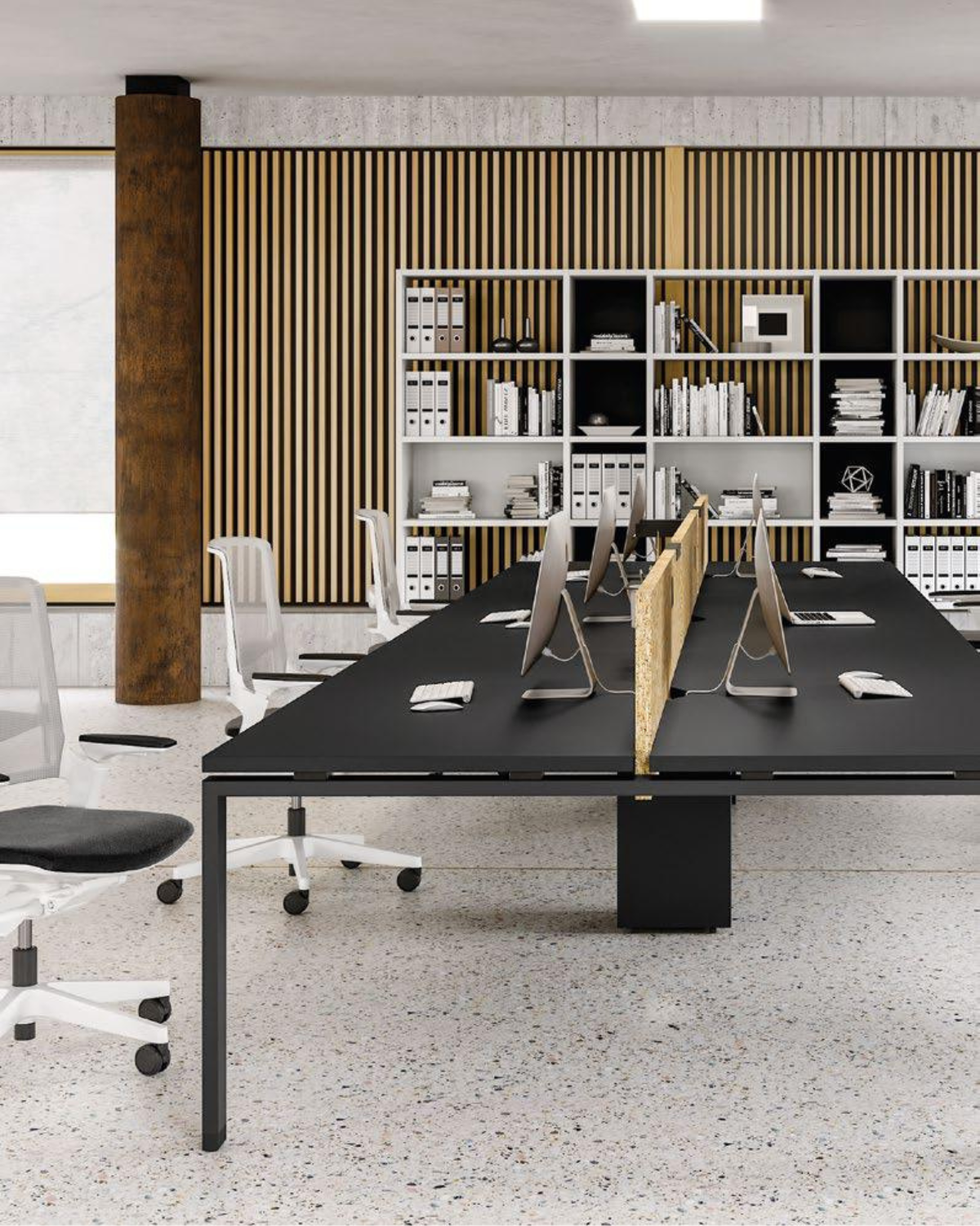 Ce bureau professionnel moderne se distingue par sa gestion intelligente de l’espace :