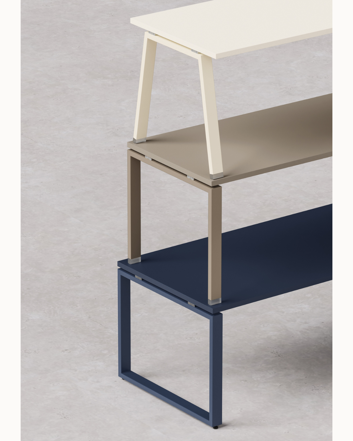 Les pieds du bureau table Atreo sont disponibles en plusieurs couleurs époxy et peuvent être positionnés à ras du plateau ou en retrait.