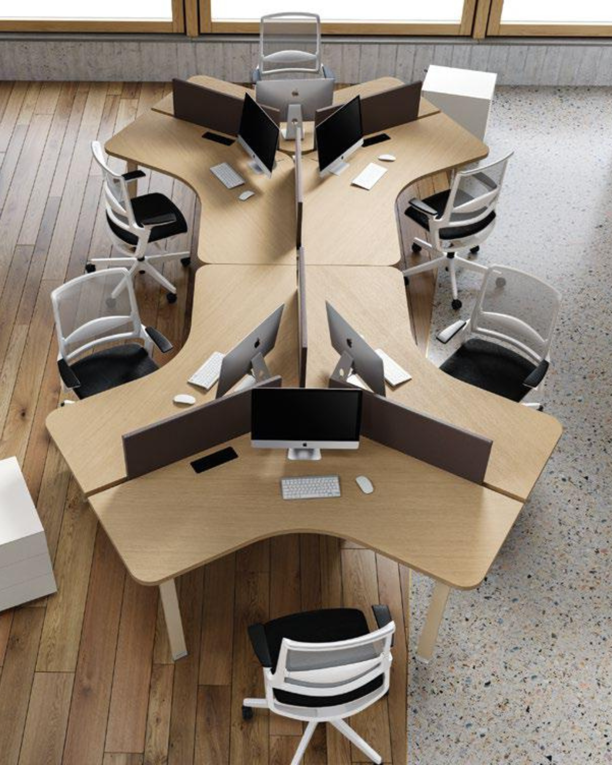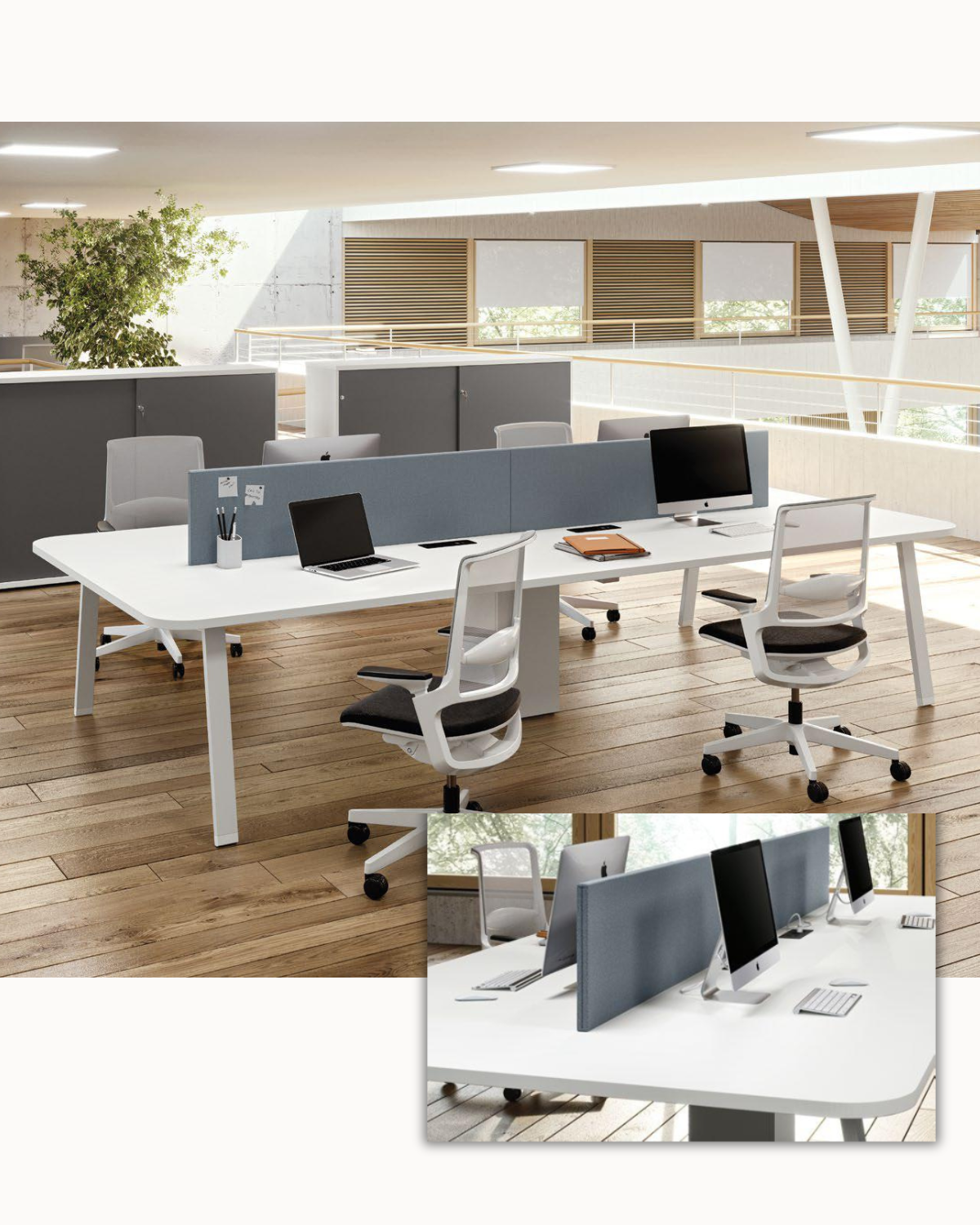 Le système Atreo permet d’ajouter des écrans de séparation au-dessus du plateau — qu’ils couvrent toute la longueur ou qu’ils soient rentrants — pour préserver l’intimité et améliorer l’acoustique.
