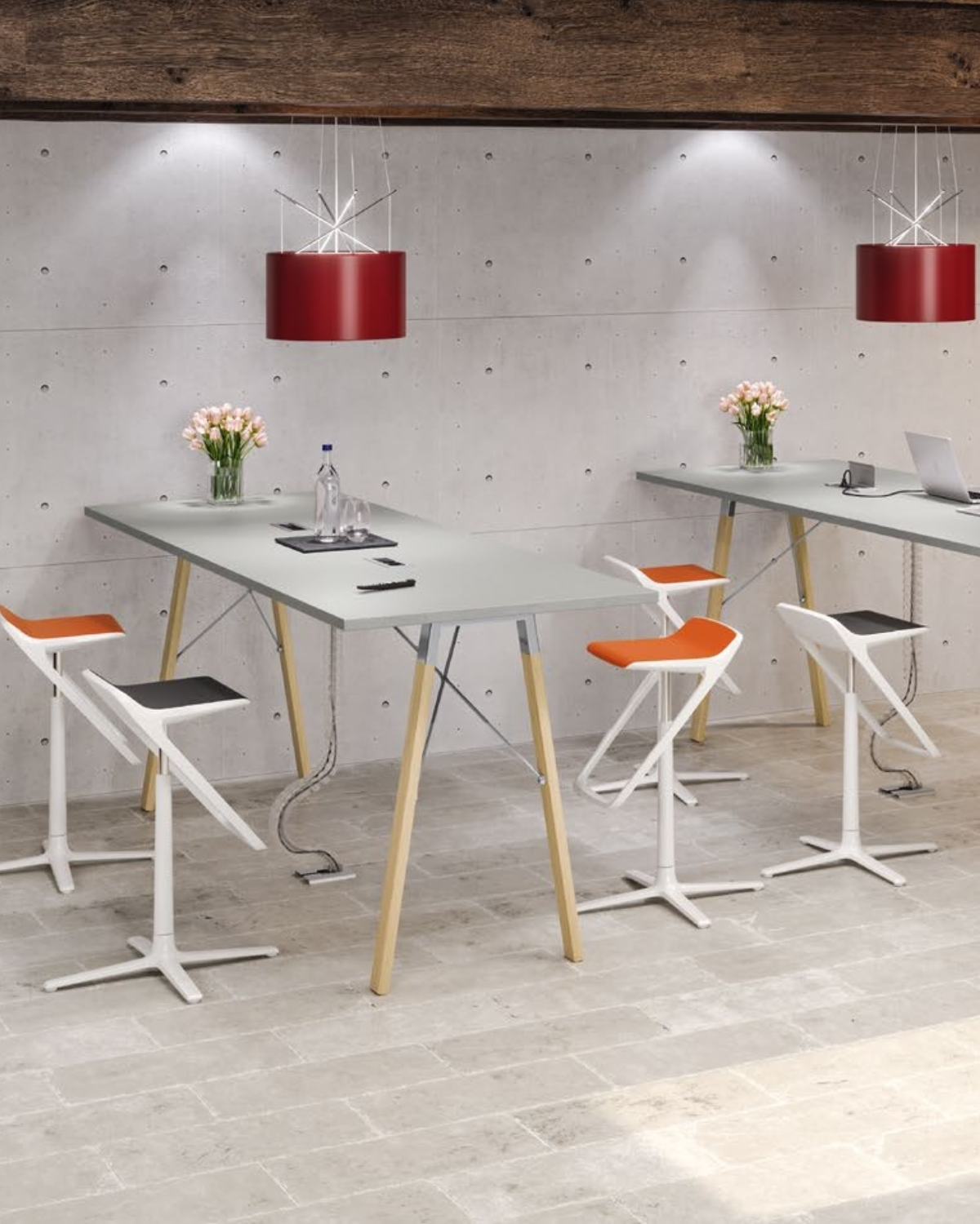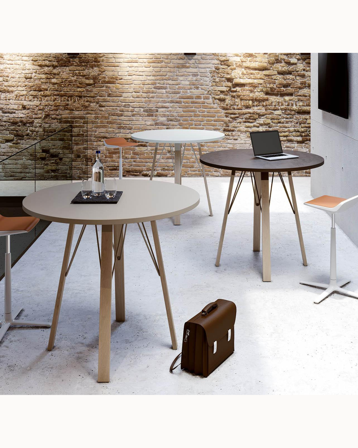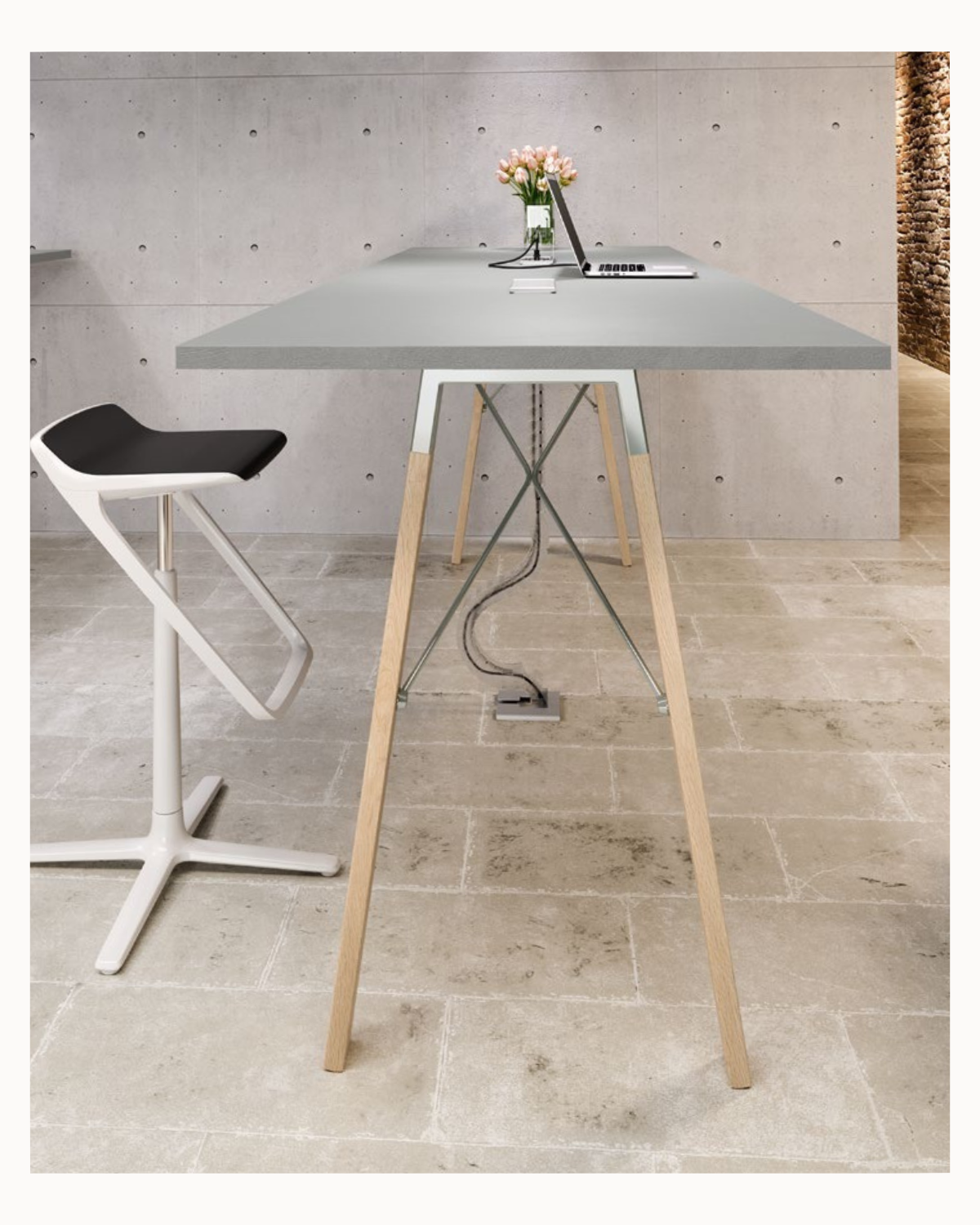 • High Table : pied de 102 cm avec tirants métalliques spécifiques, supportant des plateaux