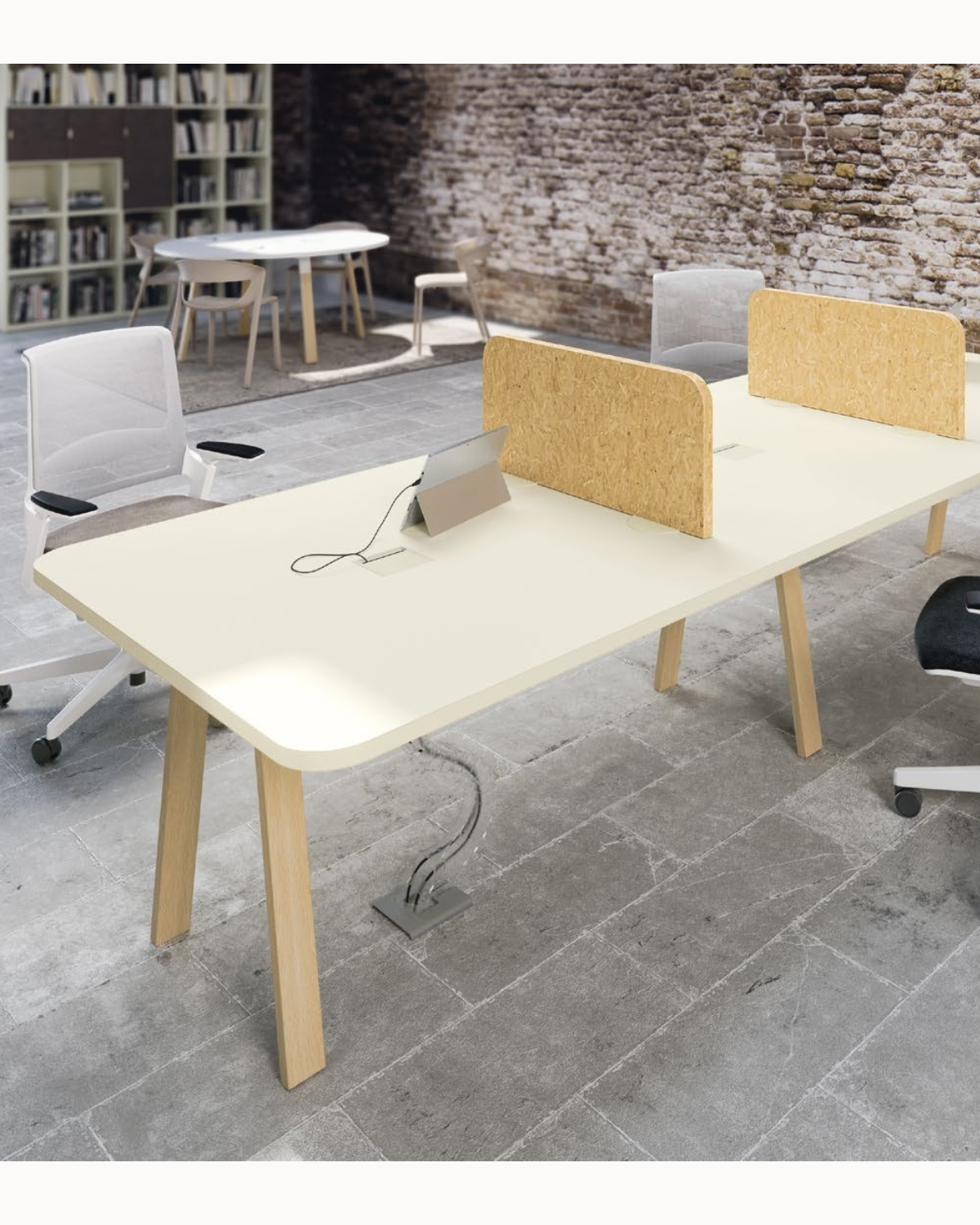Les plateaux extra larges s’adaptent à vos besoins : ils peuvent servir de bureau de travail en bois ou se transformer en table de réunion grâce à des écrans de séparation amovibles. Disponibles en plusieurs finitions, dont le mélaminé italien et l’OSB de 30 mm, ils offrent à la fois solidité et esthétisme.